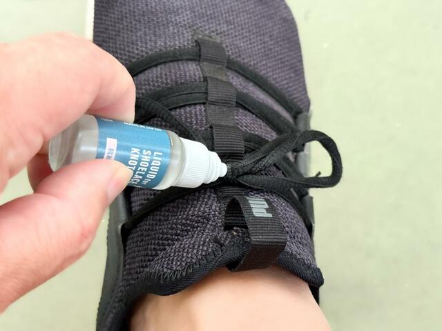 まず、靴紐をいつもどおりに結んだら結び目に「靴紐のほどけ止め液」を2滴垂らします。
