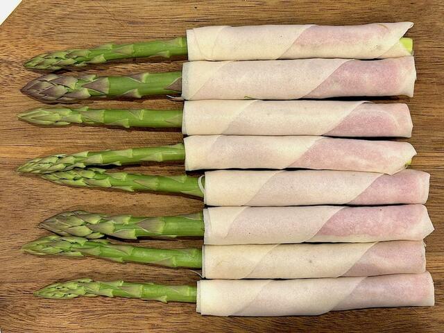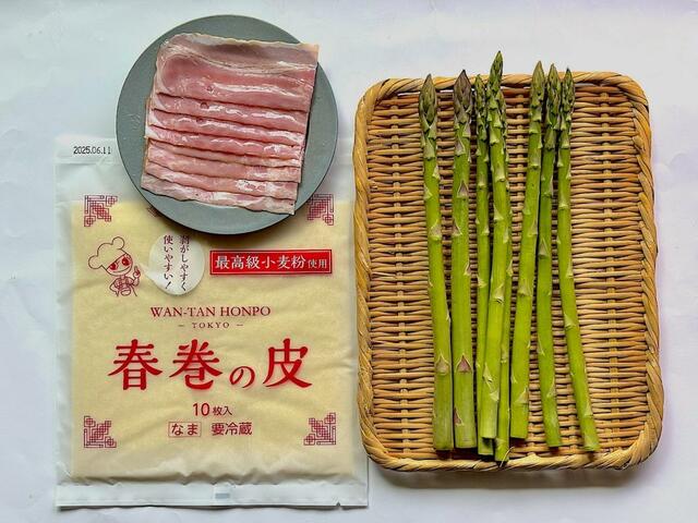 穂先のほぐれるような食感と茎のサクサク感、そして半分に春巻きの皮を巻くことでクリスピーさもプラスしてみました。