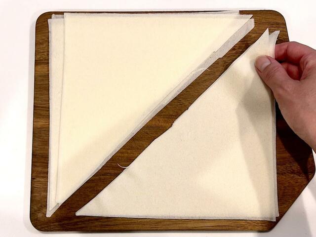 2. 春巻きの皮は三角形になるように半分にカットする。
