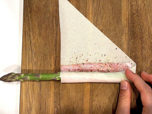 4. 皮の端にアスパラガスをおき、くるくると巻いていく。巻き終わりは皮の端に水をつけて留める。
