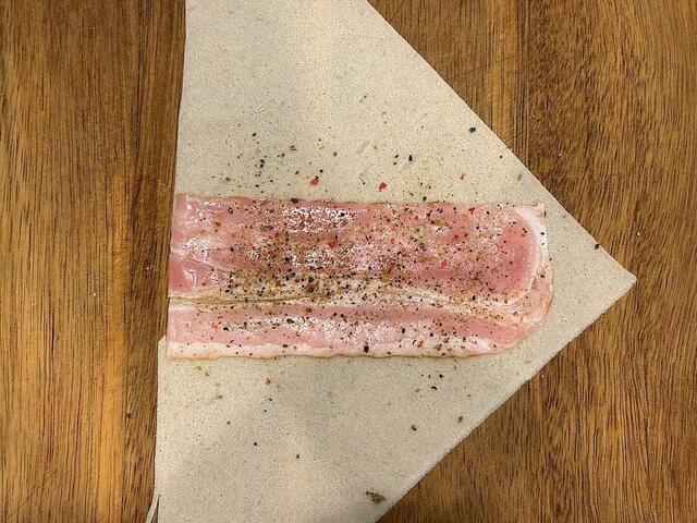 3. 春巻きの皮の中央にベーコンをのせ、こしょうを振る。