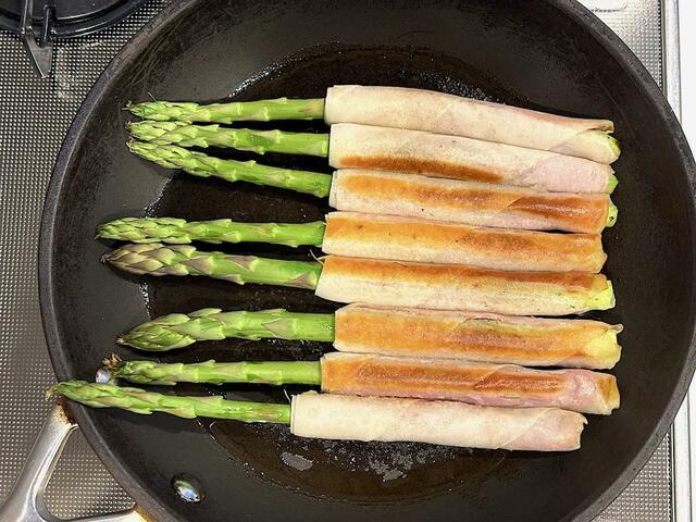 5. フライパンに油をひき、4を並べて焼く。皮に焼き色がつき、アスパラガスがしんなりとしたらできあがり。