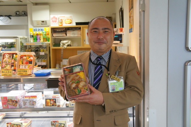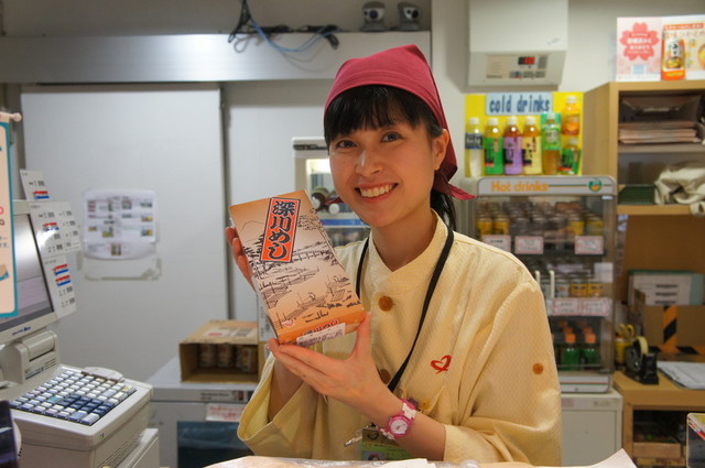 「私はこれ! 深川めしが大好きなんです」と、販売スタッフの宇積(うづみ)さん 拡大画像表示