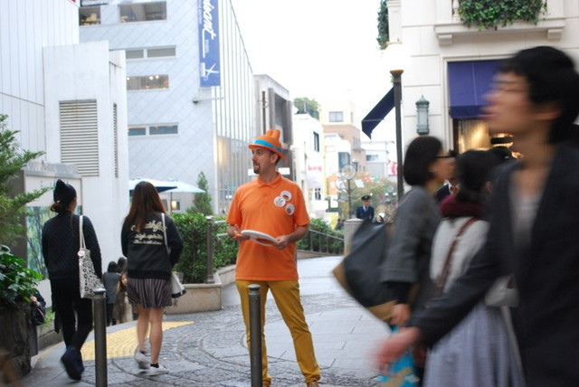 とにかくスゴイ人!! ニコラシャールさんも街頭に立ち、オープンのPRをしています。