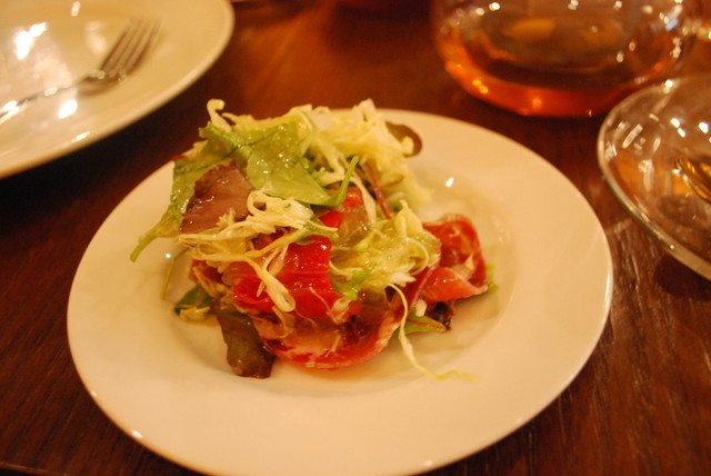 最近おしゃれ系ドリンクなどでも使用されている「メイソンジャー」。こちらはモッツアレラチーズやベビーリーフ、コッパーの生ハム、コンソメゼリー、ストロベリードレッシングが入っています。