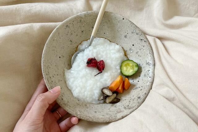 これはコロナで寝込んでいた日、パートナーが作ってくれたお粥。食器・スプーン・お米の白さと、カラフルなお漬物たちのコントラストにキュンとして、体調が悪いながら思わず写真を撮っていました。