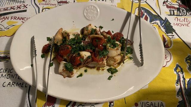 ヤリイカのソテー(ニンニク、アンチョビ、ペペロンチーニ、ドライトマト、イタリアンパセリ)。