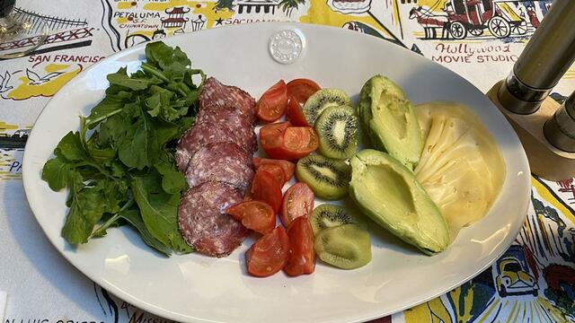 野菜などの前菜(ルコラ、サラミ、トマト、キウイ、アボカド、チーズ)。