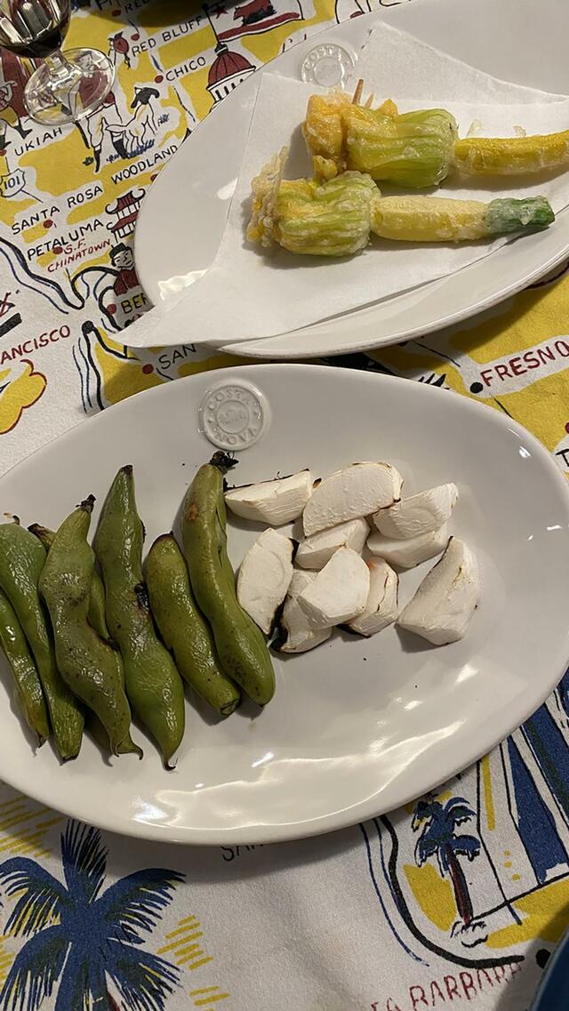 花ズッキーニのベニエ、焼きそら豆とカブ。