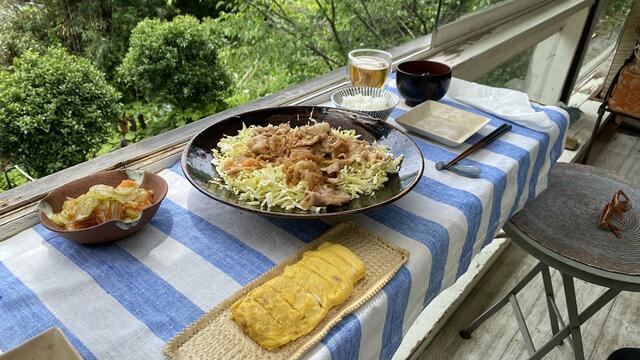 豚肉の生姜焼き、白菜キムチにきゅうりを混ぜた(きゅうりなんて混ぜなきゃよかった)、卵焼き、しじみの赤だし。豚肉なのにトンビがやってこない。なんだか寂しい。