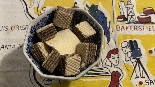 バニラアイスとウエハース。一番美味しかったのは、ヤリイカのソテーかなあ。