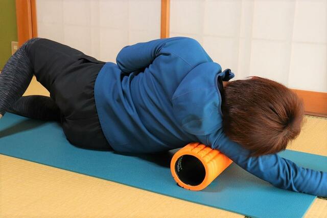 デスクワークの多い日には、脇の下をコロコロしてあげましょう。背中や肩周りのコリがほぐれますよ。