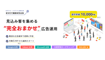 NTTタウンページは5月29日、デジタルマーケティング分野における中堅・中小企業のビジネス支援などを目的とした新たなウェブ広告運用サービス「まかせて繁盛WEB広告」の提供を開始した。提供価格は月額5万5000円から。