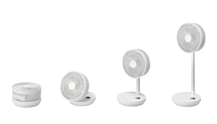コードレス式で、高さは3段階調節が可能なのでリビングやキッチン、脱衣所、寝室など家の中はもちろん、アウトドアでも使うことができる。また、折りたたんで真上に風を送れば部屋干しのサーキュレーターとしても活躍する。