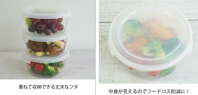 そして、このフタにも工夫あり。丈夫な作りで重ねて収納できるうえ、半透明なクリアカラーで容器の中身が見えるので「食べ忘れ」を防げるんです。