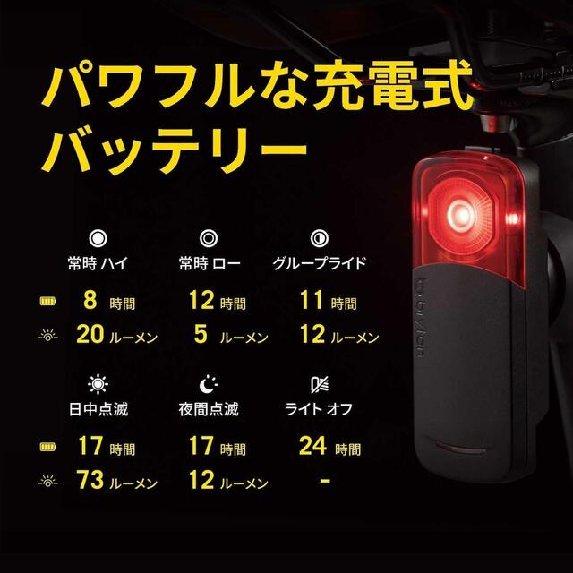 視認性の高いリアライトに加えて、ブレーキランプ機能や最大17時間稼働のロングバッテリーも備えており、長距離のサイクリングにも安心して使えるのがうれしいですね。