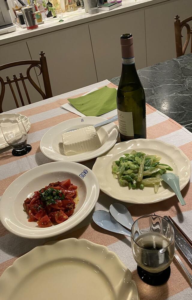 トマトとドライトマトとピンクペッパー、蕗とそら豆とスナップエンドウ。