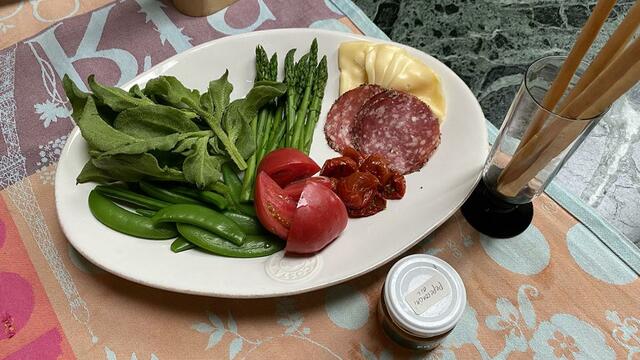 お供は野菜中心のお皿:アイスプラント、ミニアスパラ、スナップエンドウ、トマト、ドライトマト、チーズ、サラミ。