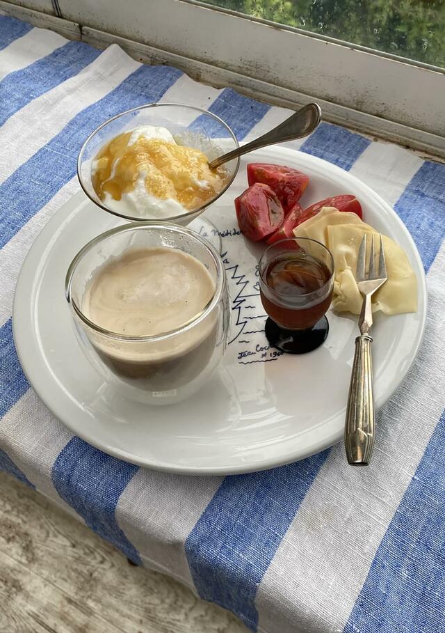 すごい風と雨。台風みたいだ。Café au lait、yoghurt蜂蜜、生トマト、チーズ、本日の元気。