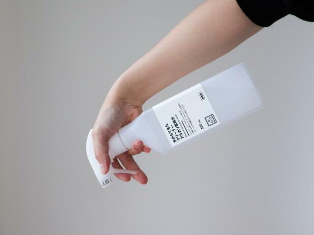 もう一つ無印良品のこのアルカリ電解水の好きなのは、スプレーボトルが逆さ向きでもスプレーできるところ。