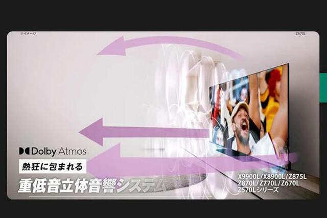 音響も立体音響技術「Dolby Atmos(ドルビーアトモス)」に対応。映画館のように立体的で迫力のあるサウンドをおうちでも味わえます。