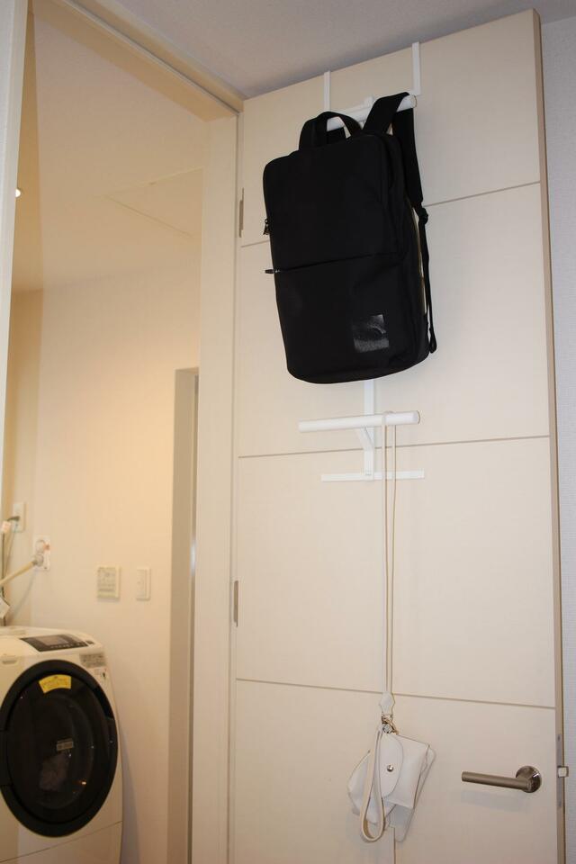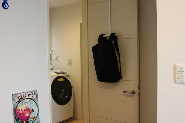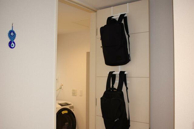 というわけで、玄関脇にある洗面所のドアに取り付けることにしました。すると、どうでしょう。あんなに邪魔だったリュックがすっきりと収まりました。