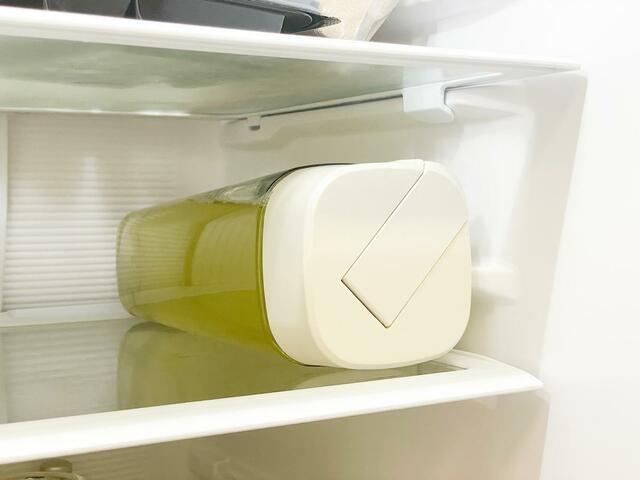 そして肝心の冷蔵庫での保管ですが、フタでギュッと密閉できるので棚にヨコ置きしてOK。