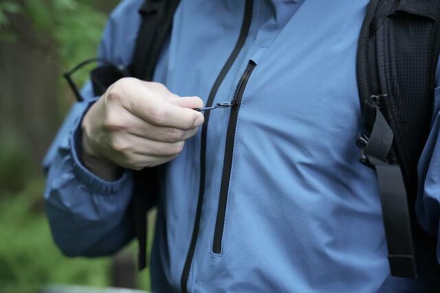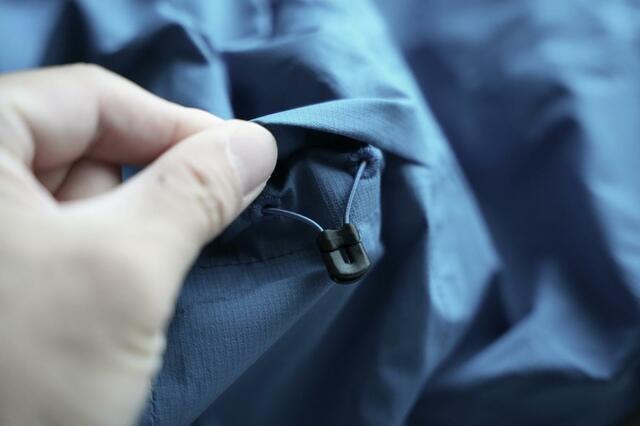 フード、袖、裾の部分はドローコードで絞れるようになっており、雨や風の侵入を防げるようになっていたりと、抜かりがありません。
