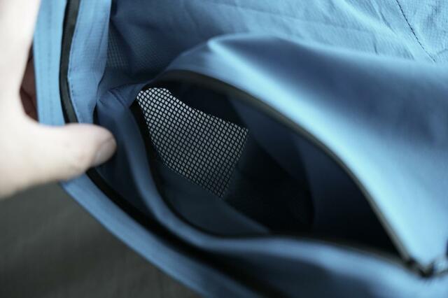 ちなみにパッカブルにするときには、この胸部分のポケットに本体を入れる形になるのですが、このポケットはメッシュになっており、ベンチレーションの役割も担っています。
