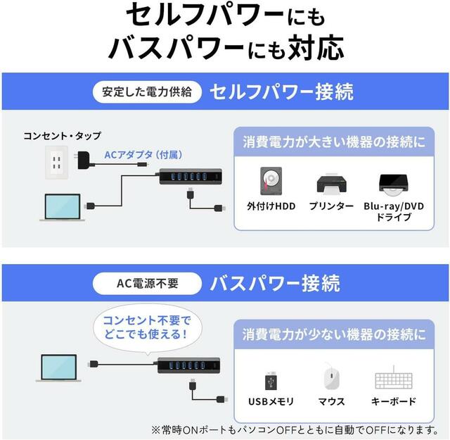 2種類の通電方法を選べて、USB機器を最大7台接続可能
