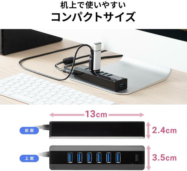 サンワダイレクトの「7ポート USBハブ」の製品サイズは、約幅13.0×奥行3.5×高さ2.4cmとデスク上で使いやすいコンパクトサイズ。