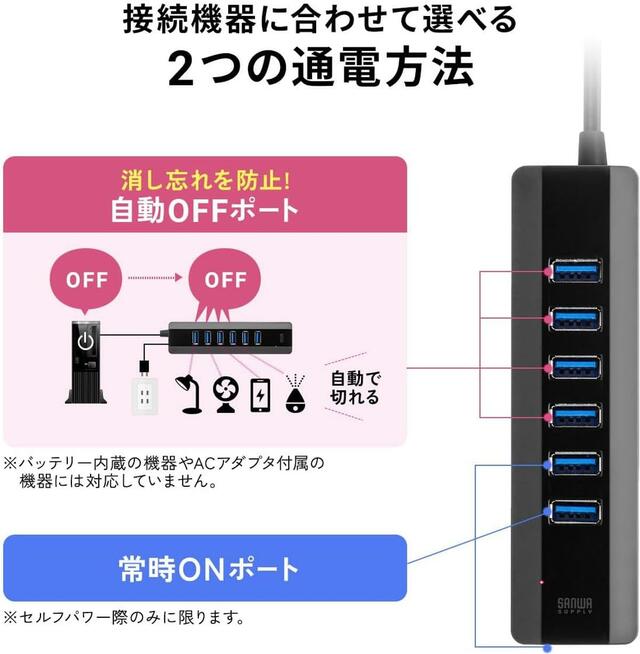 「7ポート USBハブ」の7ポートのうち4ポートは自動オフ機能付きの自動オフポートで、残りの3ポートはオフにならない常時オンポートになっているので、接続機器によって2つの通電方法を選ぶことが可能。