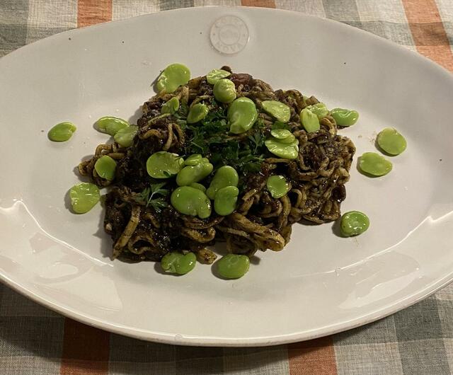 頂き物のイカ墨を使って手打ちパスタ。小倉シェフのレシピを基本に。ミョウガじゃなくてソラマメを蒔きました。ウメェ〜〜〜です。