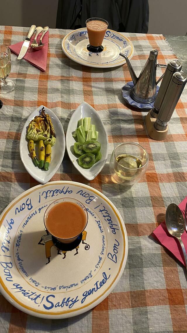 ガスパチョがうまい! 作ったの、1年ぶりだろうか。毎日、花ズッキーニのフリットを食べたくない。考えあぐねた末、グリルしてみましたところ、とっても美味しい。きゅうりとキウイ。
