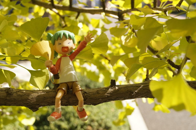 「国営昭和記念公園」には綺麗に整備されたイチョウ並木があり、木漏れ日のなかを歩くのはすごく気持ち良いでしょう。でも通り抜けるだけではもったいないので、よつばちゃんにはイチョウの落ち葉を持たせて撮影してみました。