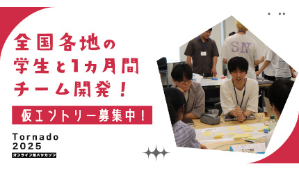 Tornado実行委員会は、学生向けハイブリッド型ハッカソン「Tornado2025」を8月7日~9月13日までの約1カ月間開催する。オフラインとオンラインを組み合わせた「ハイブリッド型」なのが特徴。キックオフと最終審査会はオフライン、実際の開発はオンラインで行う。学生の参加エントリー期間は6月1日~6月30日。8月7・8日のキックオフイベントを経て、8月9日~9月7日まで開発。9月17日に開く最終審査会で優勝チームを決める。ハッカソン実施の目的は「学生の創造性とビジネススキルの向上」「異分野・異地域の学生との交流促進」「チームワークと問題解決能力の養成」「将来のキャリア支援」の4つだ。