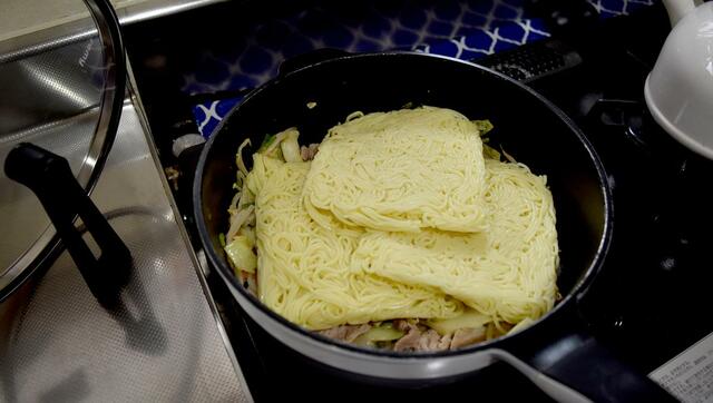 焼きそばやチャーハンなどを多めに作るときも、レミパン1つで大丈夫。焼きそばだったら具沢山にして3玉入れても少し余裕があります。まるで中華鍋のよう。