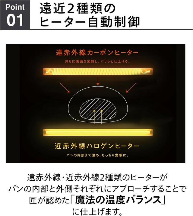 庫内上に遠赤外線、下に近赤外線と性質が異なる2つのヒーターを設置し、「魔法の温度バランス」を実現。