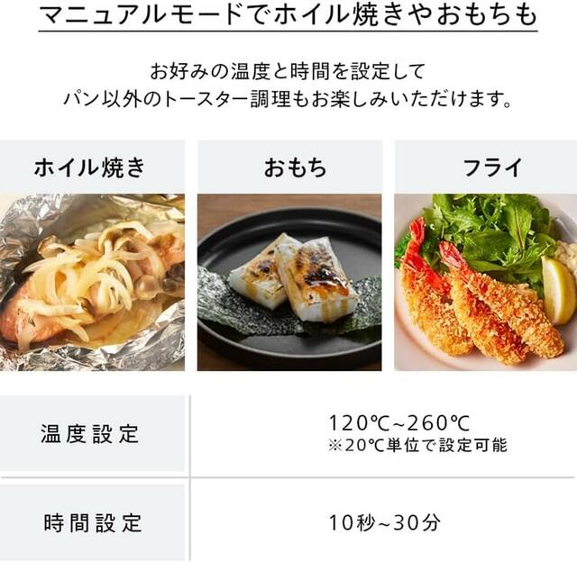パンだけでなく、餅やグラタン、ホイル焼きまで、幅広く活用できるマニュアルモードも搭載しています。