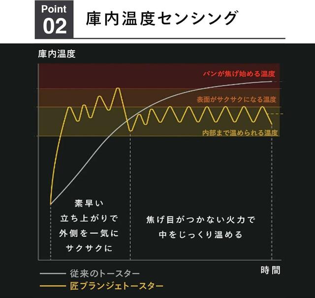素早い立ち上がりで外側を一気にサクサクにした後、焦げ目がつかない火力で中をじっくり温める「庫内温度センシング」もおいしさの秘訣。
