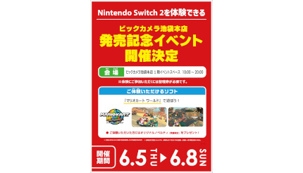 ビックカメラは6月5~8日の各日10~20時に、「Nintendo Switch 2」をいち早く体験できるイベントを、ビックカメラ池袋本店(東京都豊島区)店頭の特設コーナーにて開催する。