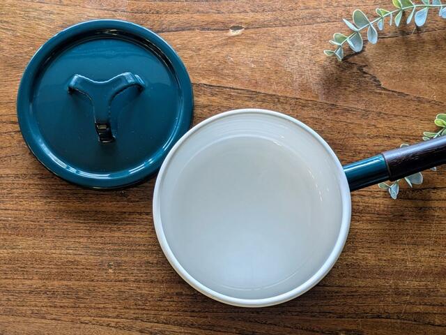 深い鉄色のホーローと天然木のハンドルの組み合せがお洒落な片手鍋。