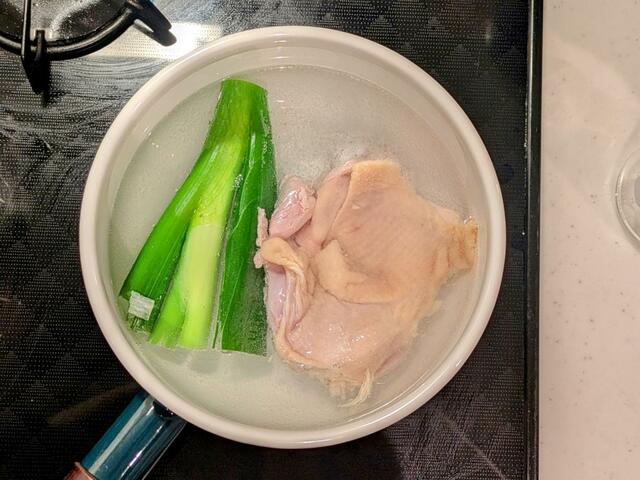まずは、ゆで鶏をつくってみました。お湯を沸騰させて弱火にしてから数分ゆでます。