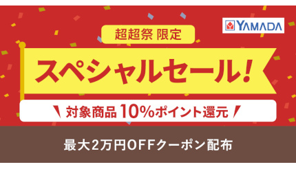 「ヤマダデンキスペシャルセール」では、対象商品の購入で10%分のポイントが還元される(ゲーム機・ゲームソフトなど一部カテゴリを除く)ほか、Pontaパス会員限定で最大2万円引きとなる割引クーポンが配布される。さらに、「ポイント超超祭」限定となるお買い得価格の目玉商品も用意している。