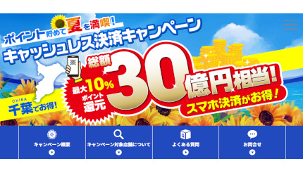 千葉県は8月1~17日の期間、県内の消費を喚起して県内事業者の支援につなげるべく、「ポイント貯めて夏を満喫!キャッシュレス決済キャンペーン」を実施する。