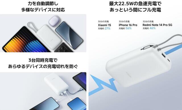 ケーブル内蔵・大容量・急速充電・コスパがそろったXiaomi(シャオミ)の最新モバイルバッテリー「22.5W Power Bank 20000mAh(Integrated Cable)」