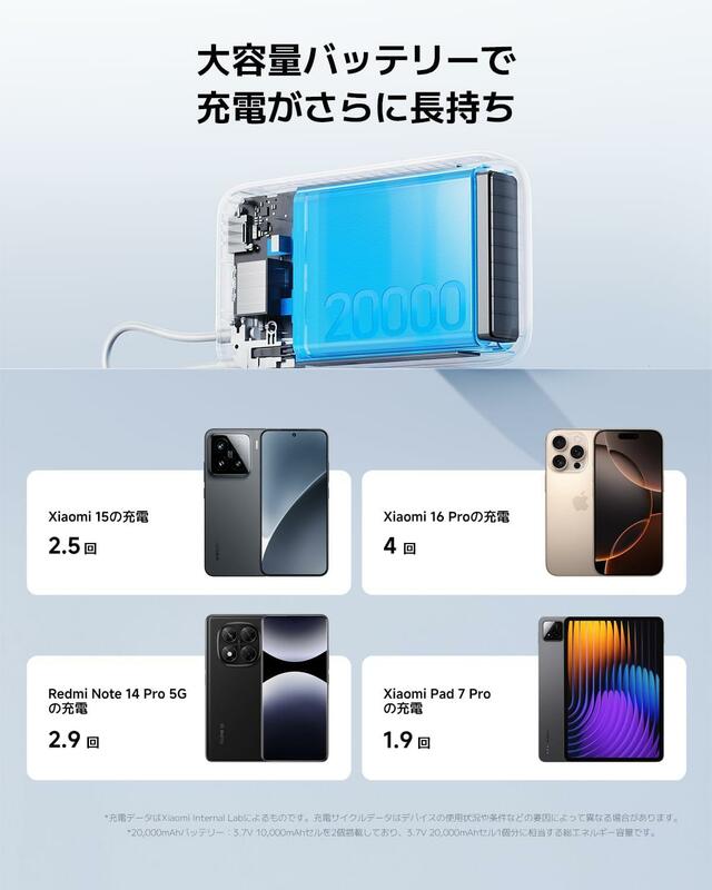 バッテリーは20000mAhの大容量。スマートフォンならXiaomi 15が2.5回でiPhone 16 Proが4回、タブレットならXiaomi Pad7が1.9回も充電が可能です。
