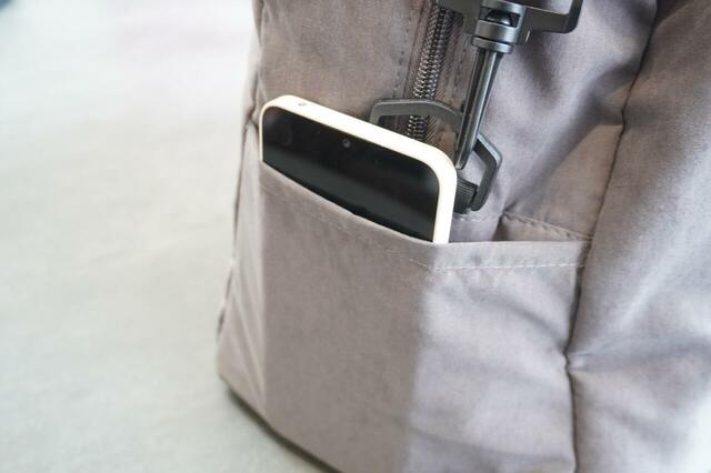 両サイドにはポケットがあるので、小物類の収納に便利です。スマホやジムの会員カードを入れて使っても◎