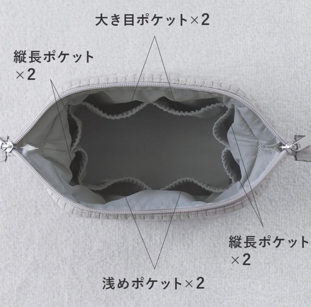 全てのポケットがギャザー仕様になっていて、中に入れたコスメなどが飛び出すのを防ぎます。