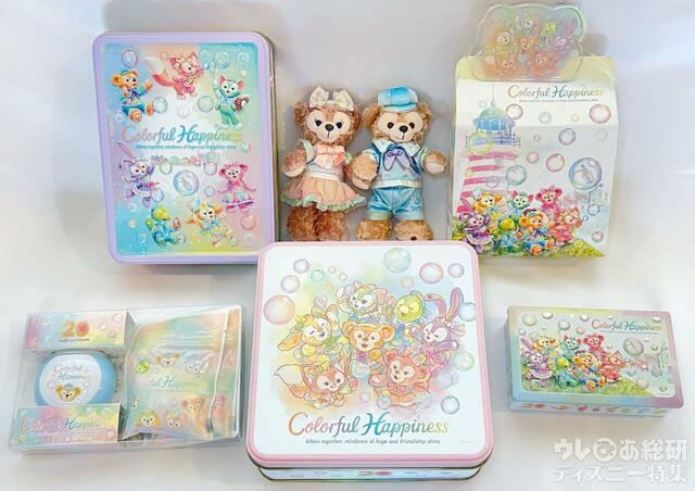 リーナちゃんのオレンジっぽいピンク、メイちゃんのピンク、ルーちゃんのラベンダー、ダッフィーの水色、オルくんのライトグリーン、ジェラのミントグリーン、クッキーちゃんの黄色の7色をぼかしのように配置。